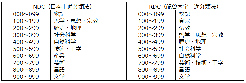 | RDC | 図書分類法の一つ。龍谷大学十進分類法(Ryukoku Decimal Classification)のことで、本学独自の分類法。仏教関係の分類に力点が置かれており、本学では大宮図書館において採用されています。 NDC/RDCの対照表 |