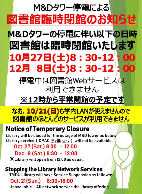 -----------------------------------------M&Dタワーの停電に伴い、下記の日程で図書館を休館いたします。